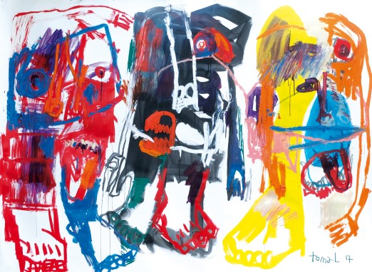 L’univers de Toma-L est particulier, il se situe entre l’art figuratif, inventif, où les traits épais donnent vie à ses figures. Ses toiles sont de réelles compositions. Il utilise le crayon gras, l’acrylique, l’huile, le pastel gras, le papier, la toile usée. On y voit des visages, ses formes sont des personnages vivants. Un rapport à la peinture de Dubuffet, un peintre qu’il apprécie et qui a été pour lui une révélation. L’expressivité de Toma se traduit dans le trait, dans le choix des couleurs, il est dans une liberté totale de création.