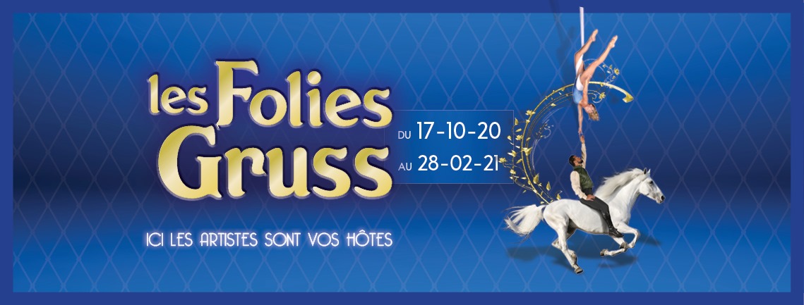Le célèbre cirque national Alexis Gruss, présente un nouveau spectacle original et festif, mêlant gourmandises, musique live et show traditionnel, intitulé « Les folies Gruss », où les artistes sont vos hôtes, sous le chapiteau du Bois-de-Boulogne parisien, du 17 octobre au 28 février 2020.