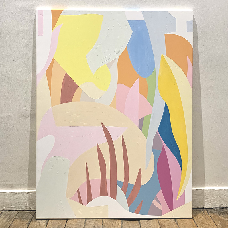 La démarche est ici différente car le digital rentre en compte. Il conçoit numériquement les œuvres avant de les transformer et de les peindre à l’acrylique.