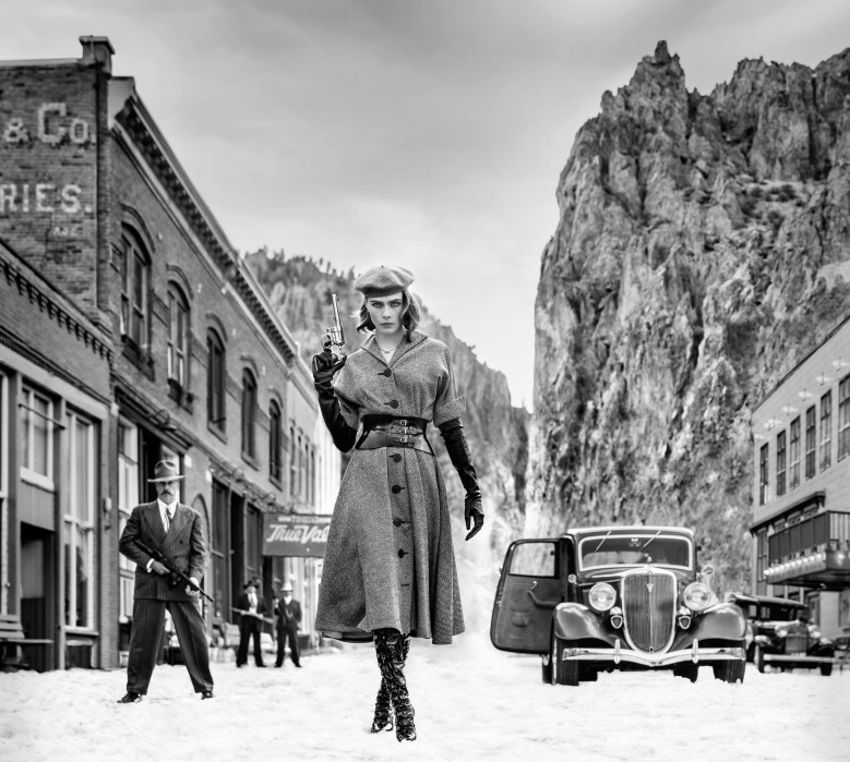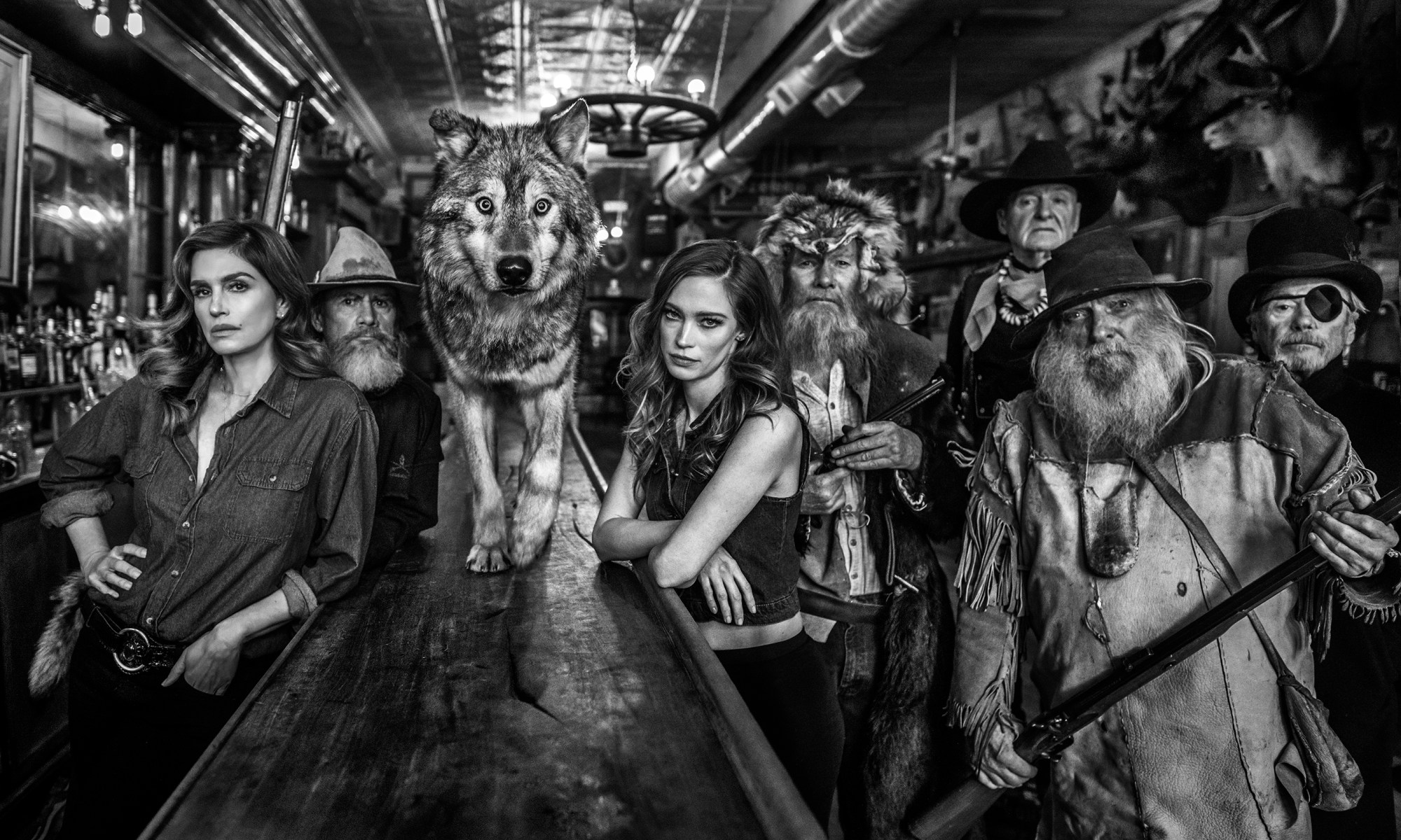 Une grande partie de mon inspiration vient des peintures du Far West. Par leur définition, elles sont composées selon le choix de l’artiste. Il n’y a pas de déséquilibre de composition car l’artiste est aux commandes. C’est ainsi que nous avons travaillé. Les cadres sont picturaux. Les clichés intérieurs des anciens saloons sont particulièrement soignés et l’équipe de production a porté une attention particulière aux détails. Les gros plans composés comportaient des hors-la-loi, des filles de saloon, des chercheurs d’or, des grizzly, des cow-boys capitalistes, des vendeurs d’huile de serpent, des joueurs et des amérindiens. Les photographies ludiques font systématiquement référence au cinéma, aux traditions de l’Ouest américain. Nous avons commencé à travailler sur ce sujet il y a deux ans, au Montana, avec Cindy Crawford et notre travail a continué d’évoluer et de mûrir. Il n’y a pas de complaisance, mais je pense que nous maîtrisons maintenant très bien le format. J’ai joué un petit peu avec les personnages dans chaque photo et je ne suggère pas qu’il s’agisse de la vie réelle dans l’Ouest de 1870. Il y a un élément caricatural délibéré dans de nombreuses images finales. Nous avions utilisé des loups dans les bars régulièrement dans le passé, mais nous avons maintenant légèrement élargi notre champ de vision. Nous sommes cependant en 2021 et nous nous sommes assurés de ne pas tomber sous le coup des militants pour les animaux. Il n’y aura pas d’ours dans le bar. Les saloons des montagnes du Colorado ont été sélectionnés par rapport à leur décor, et par rapport à la lumière intérieure du jour, à la facilité de transport et à la coopération positive de leurs propriétaires.