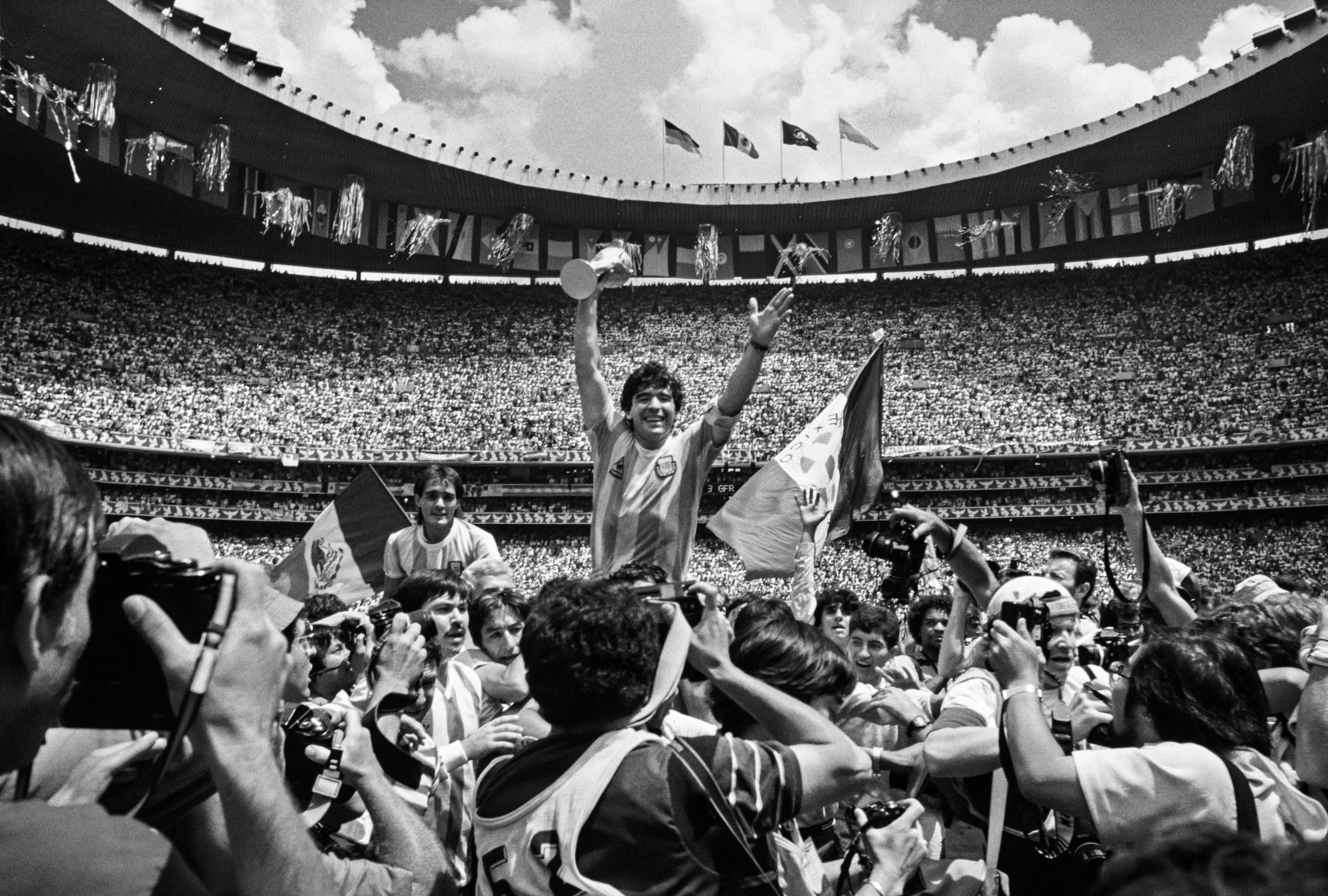 Dès ses débuts, David Yarrow immortalise la remise du trophée à Diego Maradona durant la Coupe du Monde au Mexique, pour le Times (1986).