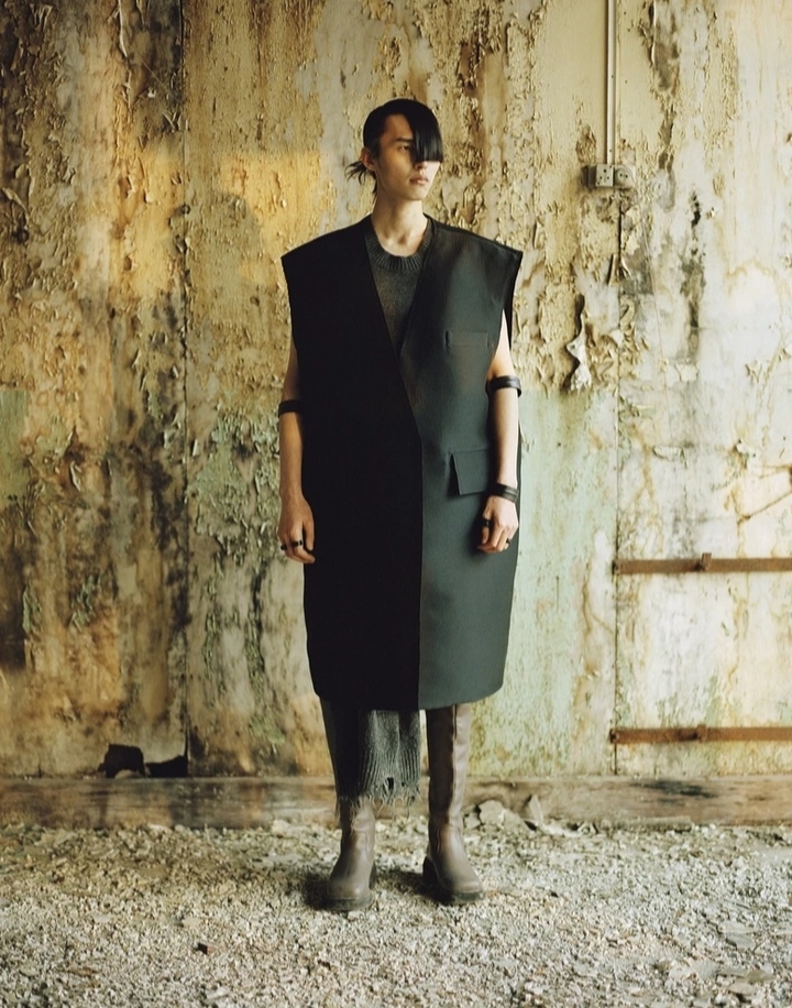 Son univers bien particulier se construit au fil des années. La musique de ce défilé est zen et relaxante. Drapés, ampleurs des tissus, tons crèmes et clairs des ensembles, il associe la tradition et la modernité. Les costumes sont over size. D’autres pièces en maille ceinturée ont des cols montants. Structure, équilibre et symétrie se retrouvent dans cette collection. Les looks s’enchainent commençant dans des teintes claires pour finir par des teintes sombres, des cuirs noirs, des cols démesurés.