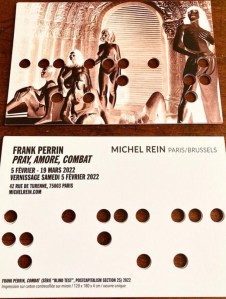 « Pray, Amore, Combat » en sont les maîtres mots. Ici, l’oeuvre photographique est différente : une photo en négatif imprimée sur carton, avec un langage en braille. Il propose une oeuvre étonnante, brute, conséquence de tant de tensions dans notre société. Du 5 février au 19 mars 2022.