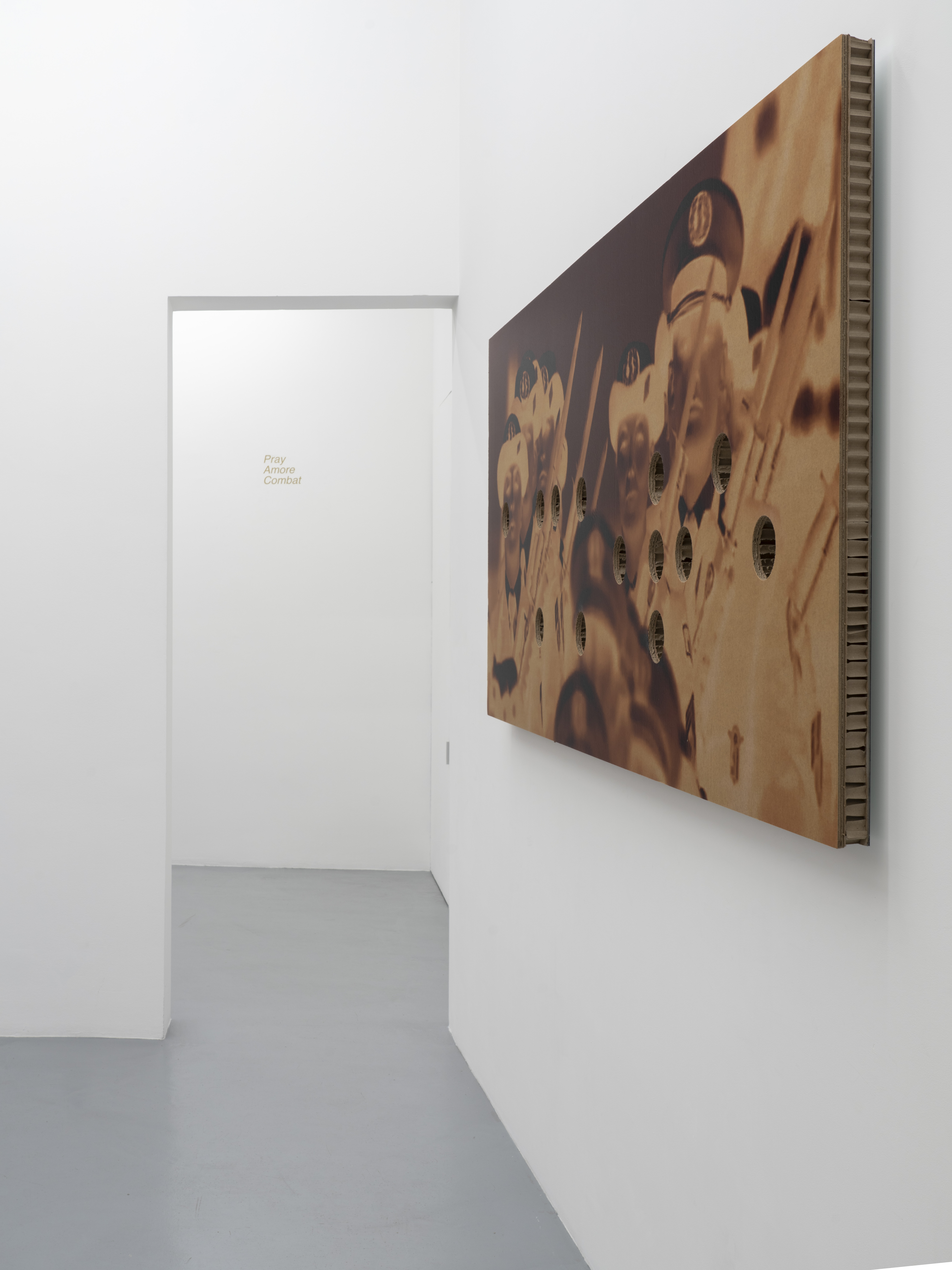 « Pray, Amore, Combat » sont trois mots cachés dans les œuvres. Une oeuvre s’appelle Amore, l’autre Pray et la troisième Combat. C’est une envie de pousser un cri de révolte générique. J’ai essayé de mettre en forme le langage premier de la révolte.