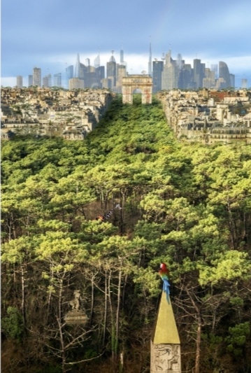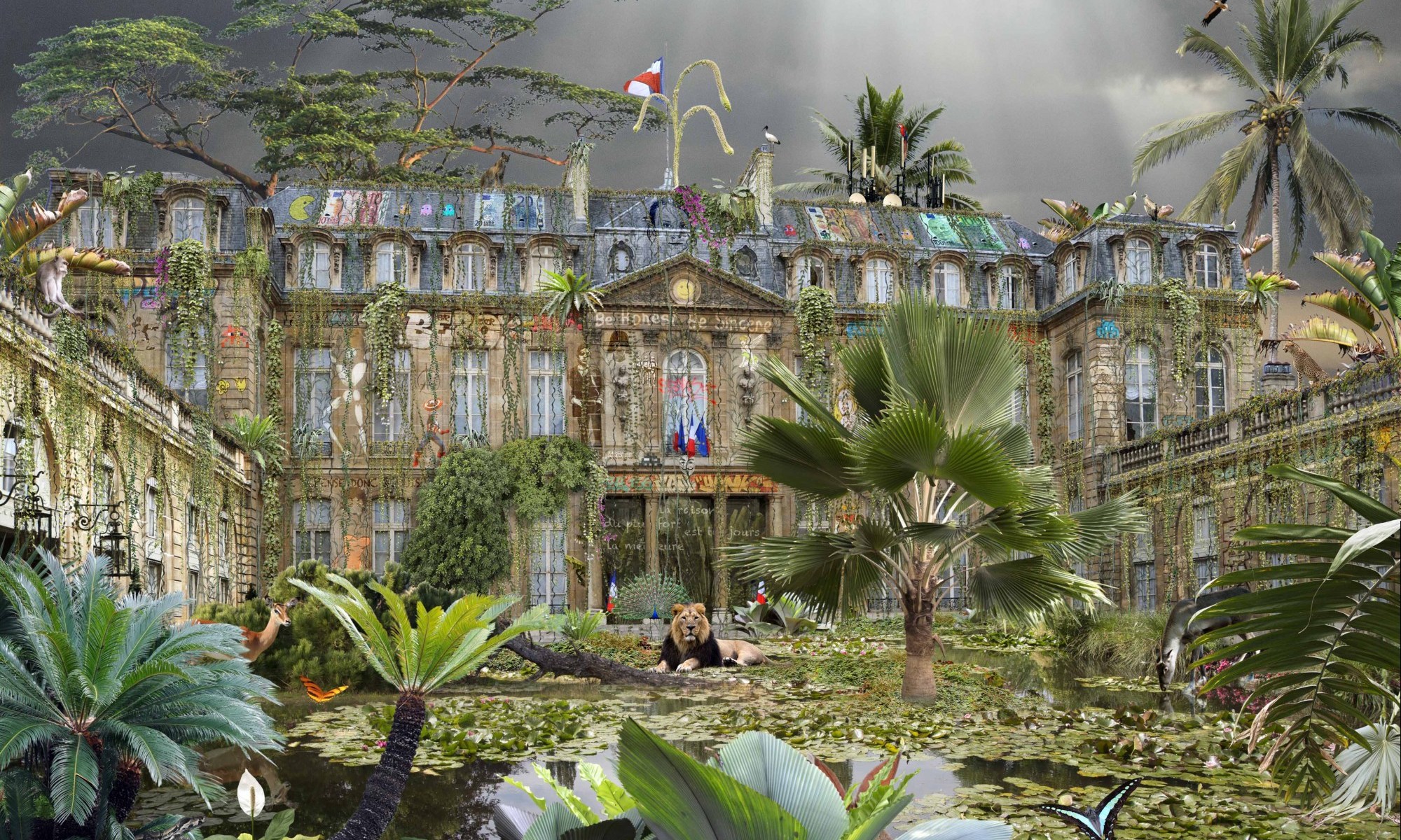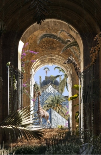 L’artiste positionne des girafes devant le « New York Brooklyn Bridge Lianes », la Tour Eiffel est entourée de végétation tropicale…l’image de base reste la ville. Les personnages, les fleurs, la nature, sont placées après.