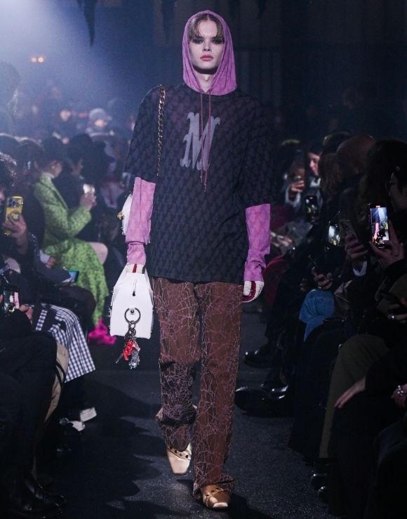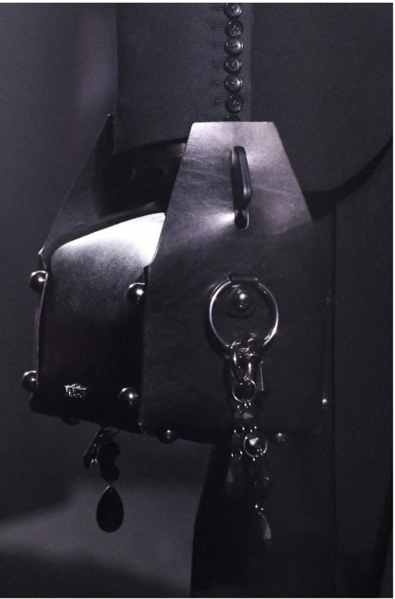 L’atmosphère particulière du lieu du défilé est empreinte d’étrangeté et de sobriété. Le décor est posé, la musique entraîne les silhouettes dans une marche lente. Notons les détails présents dans les différents looks : des chaînes posées sur des blousons en cuir, des gants noirs. Les sacs peuvent contenir le bonheur à venir, les chaussures dont certaines avec strass, les trous de casquettes ornées de strass également…les pièces sont au complet. Ensuite les looks s’éclairent dans des ensembles argentés, des imprimés variés.