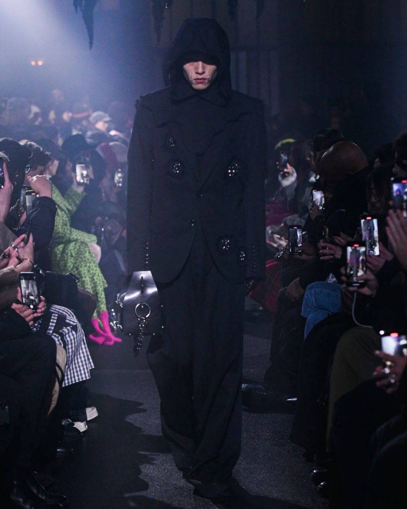 À la fois sombre et brillante, la collection FW24 est diversifiée autant par le choix des matières que des coupes. Plus introspective que les autres, l’image centrale est la chauve souris que l’on retrouve dans les formes : le col des manteaux, les capuches à col attaché avec des ourlets, les capuches des vestes de sport à double face …