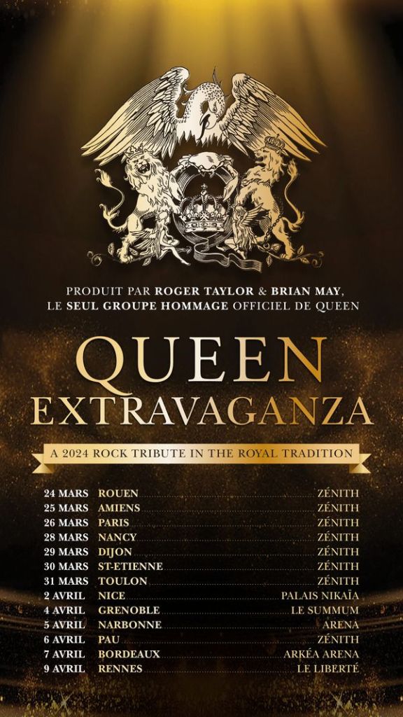 « Queen », le groupe mythique de rock est une légende. Après la disparition de Freddie Mercury, Roger Taylor, compositeur, ancien batteur du groupe et Brian May, ancien guitariste, produisent le tribute officiel, « Queen Extravaganza » avec une troupe de musiciens. Au Zénith de Paris, le 26 mars 2024 et en tournée dans toute la France.