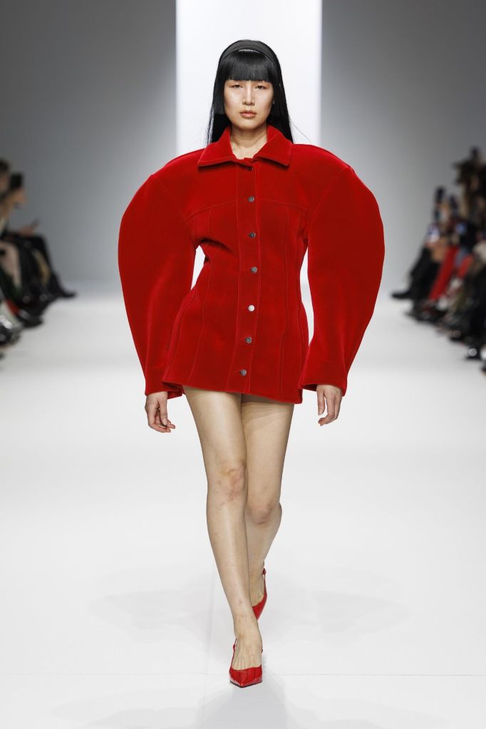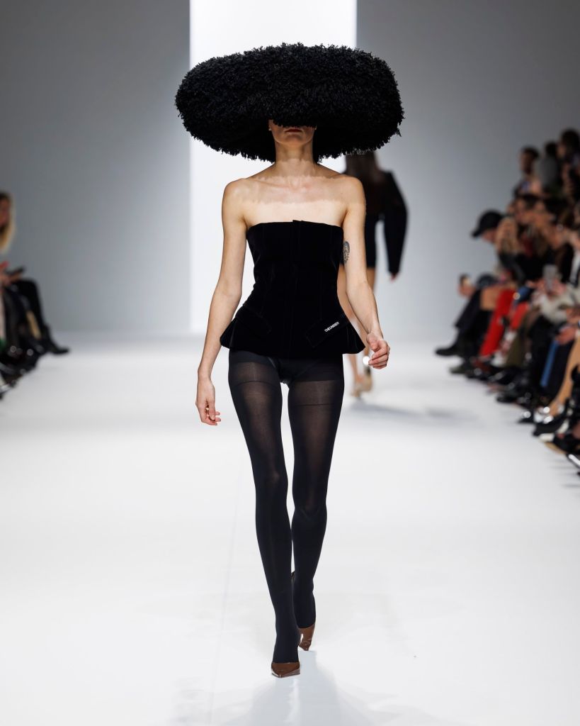 La robe iconique de la collection : des épaulettes XXL. Certains looks sont constitués de manteaux aux épaules larges et aux manches longues. Notons les accessoires dont le chapeau XXL, lui aussi.