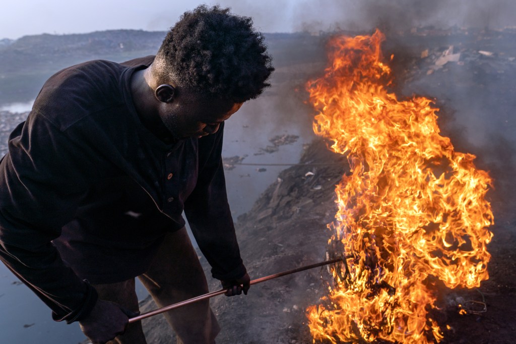 1er image ©Old Fadama, Accra, Ghana, 9 février 2023. Simon Aniah, 24 ans, brûle des câbles électriques usagés