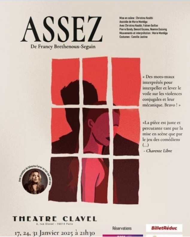 Après « Madame », comédie dramatico-clownesque, la Compagnie Bliss’Art, présente la nouvelle pièce « Assez ». Un sujet plus sombre où le couple se heurte aux violences conjugales. Cette pièce est écrite par Francis Brethenoux-Seguin et mise en scène par Christina Koubbi. Les représentations sont prévues à Paris, le 17/24 et 31 janvier 2025, au Théâtre Clavel.