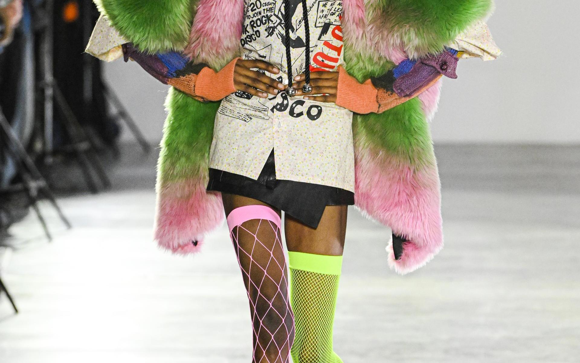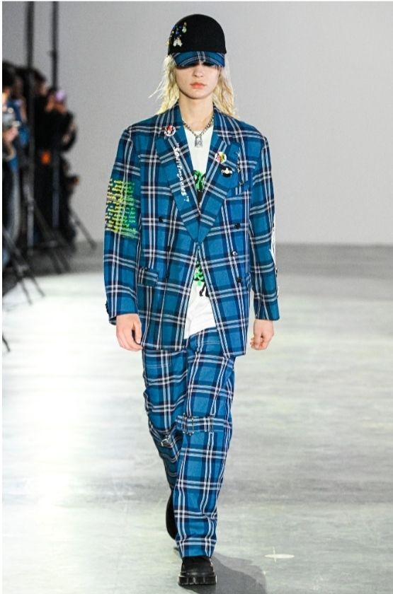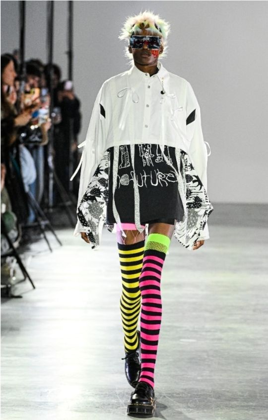 La collection automne-hiver 2025/26 réinterprète le passé pour donner une nouvelle signification. Il crée selon des souvenirs. Ses inspirations, Tokyo, Londres, l’esthétique rave et punk, dissimulées à travers les volants résilles colorés, les coiffures et les vestes amples. Il y a cette idée d’être en dehors des codes, traduite par l’intitulé « Formal Arnachist ».
