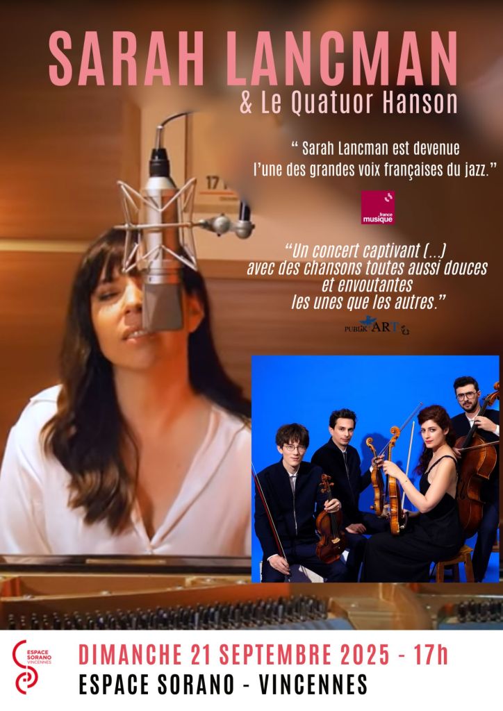 Voix et piano sont les éléments de la chanteuse, pianiste, compositrice, auteure et interprète de jazz, Sarah Lancman. La passion la guide depuis ses débuts. Les nombreuses expériences de scène de Paris à Tokyo l’ont conduit aujourd’hui à l’Espace Sorano, à Vincennes où le concert piano-voix est programmé le 21 septembre 2025. Unlimited Music France.